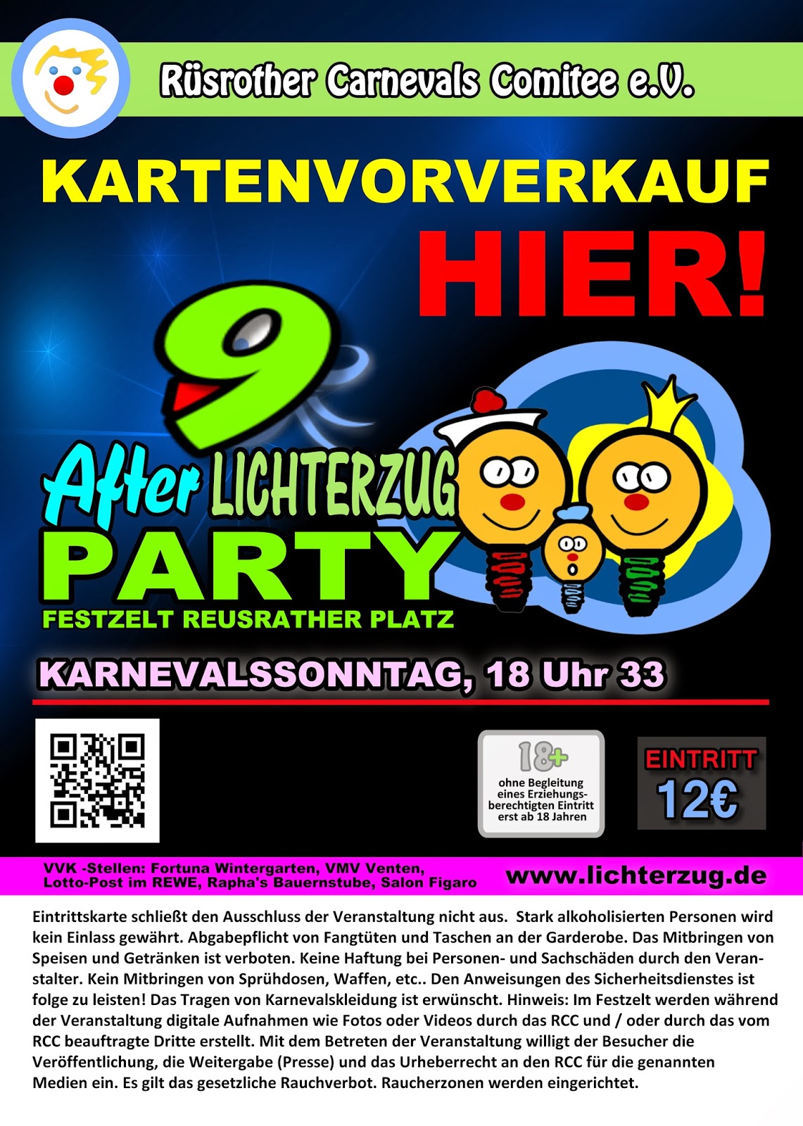 Im Anschluss an den Lichterzug füllte sich das Festzelt auf dem Reusrather Platz. 1.600 Jecke feierten bis in die Nacht zu Schunkelliedern ausgelassen auf der After-Lichterzug-Party. Da im Vorverkauf bereits alle Eintrittskarten vergriffen waren, blieb die Abendkasse geschlossen. „Leider mussten wir Leute, die gerne ins Zelt wollten abweisen da wir restlos ausverkauft waren. Wir mussten an die Sicherheit der Partygäste denken und konnten keine weiteren Gäste zulassen“, so Andreas Buchheim, erster Vorsitzender des Rüsrother Carnevals Comitees.