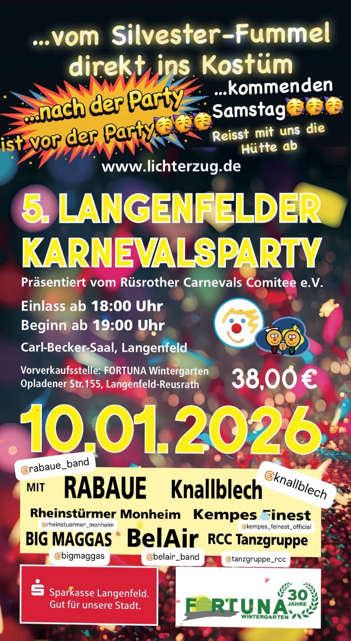 Beschlossen wurde, dass die Langenfelder Karnevalsparty im Carl-Becker-Saal nächste Session das letzte Mal stattfinden wird. Buchheim: "Zur Wahrheit gehört auch, dass man sich von Dingen trennen sollte, wenn sie finanziell für den Verein keinen Sinn machen. Eine Party mit einem Programm von über 12.000 EUR Programmkosten und Gesamtkosten in Höhe von ca. 25.000 EUR, muss einen Gewinn abwerfen. Tut sie dies nicht, sollte man die Reißleine ziehen, auch wenn es weh tut. Aber auch die letzte Party am 10. Januar 2026 wird wieder mit Herzblut von den Mitgliedern durchgeführt. Karten gibt es bei FORTUNA Wintergärten zum Preis von 38 Euro. Wir werden es noch einmal richtig krachen lassen."